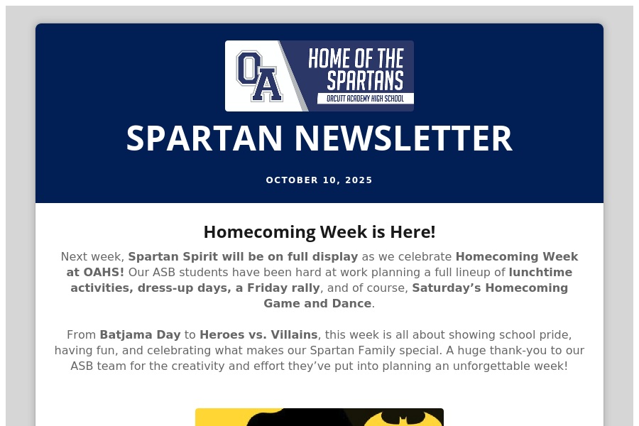 SPARTAN NEWSLETTER October 10, 2025 Homecoming Week is Here! Next week, Spartan Spirit will be on full display as we celebrate Homecoming Week at OAHS! Our ASB students. . .